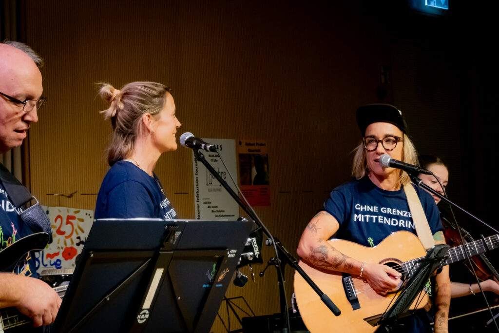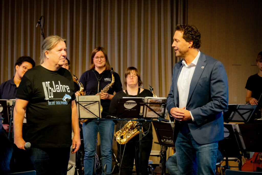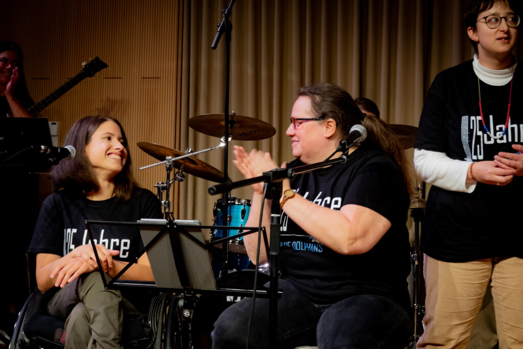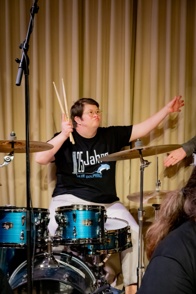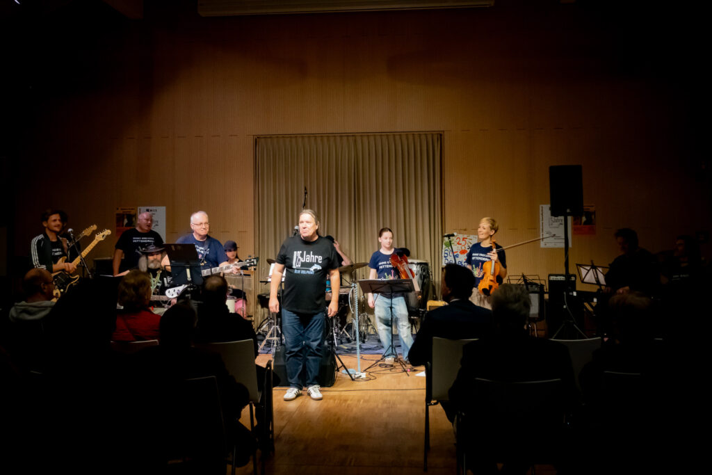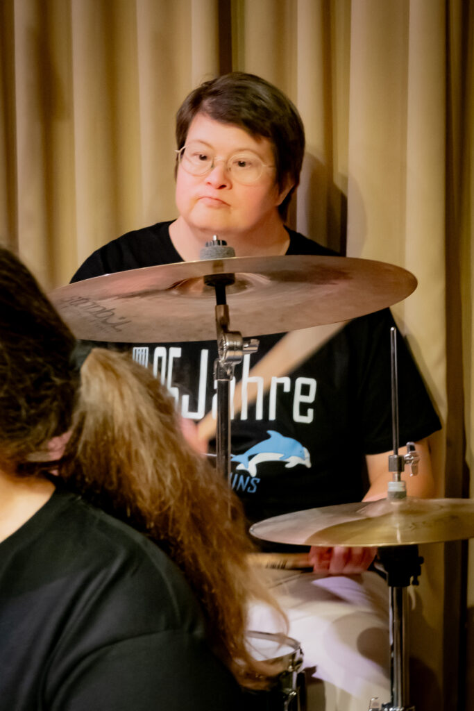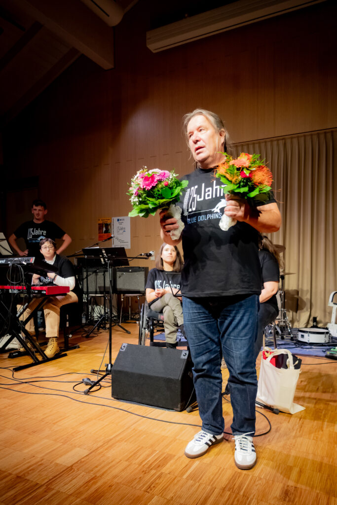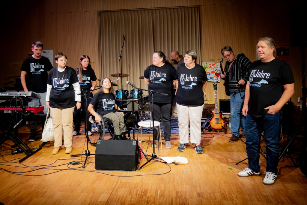 Die Blue Dolphins haben in ihren zweieinhalb Jahrzehnten schon viel erlebt. Zwei CDs wurden aufgenommen, den Tassilo Kulturpreis der SZ haben sie 2012 gewonnen und neben vielen kleineren Auftritten waren sie schon auf verschiedenen inklusiven Festivals in ganz Bayern unterwegs. Und so lag es nahe, selbst zu diesem Anlass auch ein Festival zu veranstalten. Schon mittags reisten die Bands an, man probte, kam zum Mittagessen zusammen und sah sich alte Bilder und Zeitungsausschnitte an. Die Fürther, die selbst schon erfahrene Soundfestivalveranstalter sind, kamen mit zwei Bands, die den Altersschnitt deutlich in eine jüngere Richtung zogen. Alle Neune, eine Band, in der die meisten Musiker ein Handicap haben und cold fire, eine junge Band der Musikschule Fürth, gingen dann auch erstmal zusammen auf die Bühne und zeigten, wie man das macht – einfach mal gemeinsam spielen und das Publikum begeistern. Die Kombi aus drei Saxophonen, Querflöte und Cello zu den üblichen Band-Instrumenten machte das zu einem besonderen Highlight. Nach einigen Liedern rockten dann cold fire ein paar Songs ohne die anderen, um dann zum Schluss ihres Auftritts aber wieder gemeinsam für Stimmung zu sorgen. Mit den Kulturbanausen der Musikschule Ismaning kamen noch mehr alte Bekannte – erst letztes Jahr hatte man sich dort zum „Ohne Grenzen mittendrin!“ getroffen und gemeinsam musiziert. Da wurden dann alte Klassiker präsentiert, manche davon mit neuem Text oder einfach auch mal mit Impro-Gesang. Und jeder der dabei war weiß – das Wort des Abends war „Heidelbeerjoghurt!“. Einfach genial. Zwei Gaststimmen hatten sie für das letzte Lied auch noch dabei. Das Gesangsduo Eli & Tina überraschte alle mit ihrem Song „Dabei“, das sie extra für die Kulturbanausen ein wenig umgeschrieben haben. Den Abend abschließen durften dann endlich die Blue Dolphins. Zuvor verteilte aber Clemens Wiedemann noch ein paar Geschenke, denn ohne die guten Geister im Hintergrund einer Musikschule, läuft gar nichts. So gab es Blumen für die Damen vom Büro, Nathalie und Johanna, und Herzerlwurst für unseren Hausallrounder Hans. Und als dann Clemens, als Leiter und Gitarrist der Blue Dolphins, endlich auch den Capo auf dem richtigen Steg sitzen hatte, konnten sie loslegen. Man merkt einfach, dass die neun Musikerinnen und Musiker zusammengewachsen sind – jeder Song klappte. Na gut – fast – aber das hat wahrscheinlich nur die Band selbst mitbekommen, denn hinten wurde getanzt, vorne geklatscht und auf der Bühne lauter strahlende Gesichter. Zwei Zugaben mussten es dann sein. Verdient und bejubelt.