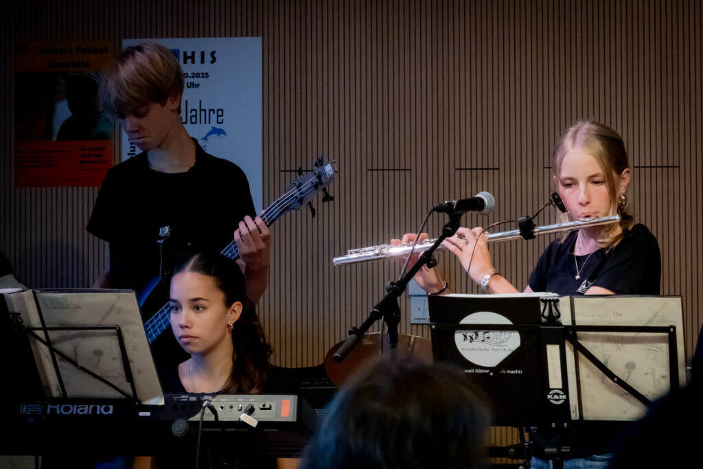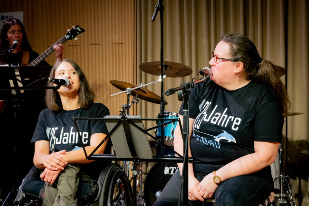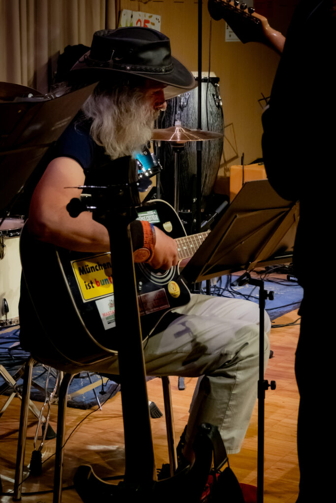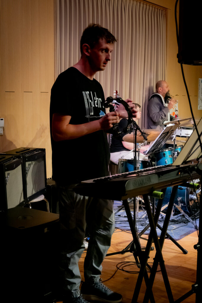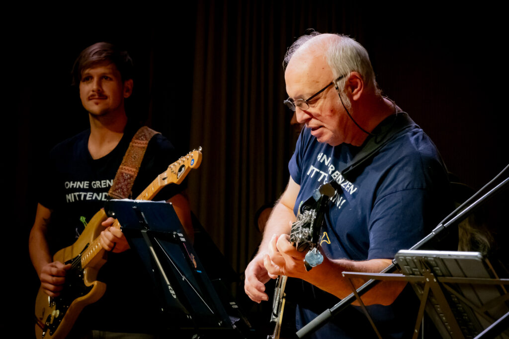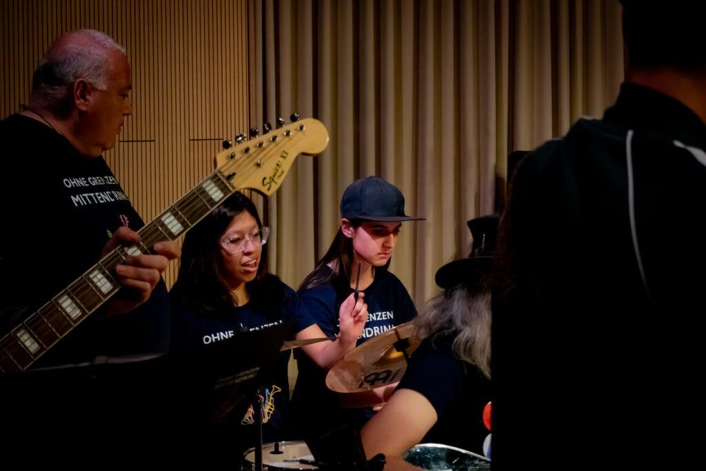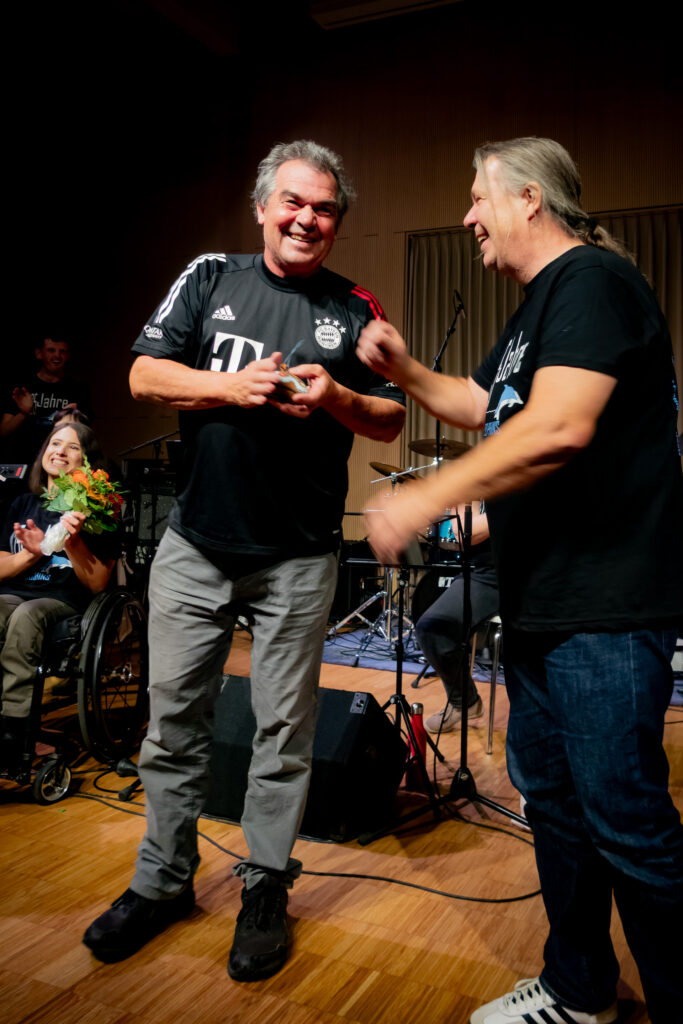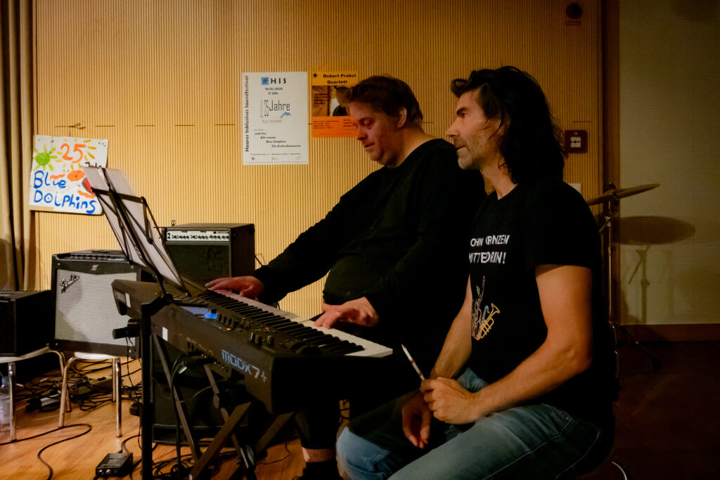 Die Blue Dolphins haben in ihren zweieinhalb Jahrzehnten schon viel erlebt. Zwei CDs wurden aufgenommen, den Tassilo Kulturpreis der SZ haben sie 2012 gewonnen und neben vielen kleineren Auftritten waren sie schon auf verschiedenen inklusiven Festivals in ganz Bayern unterwegs. Und so lag es nahe, selbst zu diesem Anlass auch ein Festival zu veranstalten. Schon mittags reisten die Bands an, man probte, kam zum Mittagessen zusammen und sah sich alte Bilder und Zeitungsausschnitte an. Die Fürther, die selbst schon erfahrene Soundfestivalveranstalter sind, kamen mit zwei Bands, die den Altersschnitt deutlich in eine jüngere Richtung zogen. Alle Neune, eine Band, in der die meisten Musiker ein Handicap haben und cold fire, eine junge Band der Musikschule Fürth, gingen dann auch erstmal zusammen auf die Bühne und zeigten, wie man das macht – einfach mal gemeinsam spielen und das Publikum begeistern. Die Kombi aus drei Saxophonen, Querflöte und Cello zu den üblichen Band-Instrumenten machte das zu einem besonderen Highlight. Nach einigen Liedern rockten dann cold fire ein paar Songs ohne die anderen, um dann zum Schluss ihres Auftritts aber wieder gemeinsam für Stimmung zu sorgen. Mit den Kulturbanausen der Musikschule Ismaning kamen noch mehr alte Bekannte – erst letztes Jahr hatte man sich dort zum „Ohne Grenzen mittendrin!“ getroffen und gemeinsam musiziert. Da wurden dann alte Klassiker präsentiert, manche davon mit neuem Text oder einfach auch mal mit Impro-Gesang. Und jeder der dabei war weiß – das Wort des Abends war „Heidelbeerjoghurt!“. Einfach genial. Zwei Gaststimmen hatten sie für das letzte Lied auch noch dabei. Das Gesangsduo Eli & Tina überraschte alle mit ihrem Song „Dabei“, das sie extra für die Kulturbanausen ein wenig umgeschrieben haben. Den Abend abschließen durften dann endlich die Blue Dolphins. Zuvor verteilte aber Clemens Wiedemann noch ein paar Geschenke, denn ohne die guten Geister im Hintergrund einer Musikschule, läuft gar nichts. So gab es Blumen für die Damen vom Büro, Nathalie und Johanna, und Herzerlwurst für unseren Hausallrounder Hans. Und als dann Clemens, als Leiter und Gitarrist der Blue Dolphins, endlich auch den Capo auf dem richtigen Steg sitzen hatte, konnten sie loslegen. Man merkt einfach, dass die neun Musikerinnen und Musiker zusammengewachsen sind – jeder Song klappte. Na gut – fast – aber das hat wahrscheinlich nur die Band selbst mitbekommen, denn hinten wurde getanzt, vorne geklatscht und auf der Bühne lauter strahlende Gesichter. Zwei Zugaben mussten es dann sein. Verdient und bejubelt.