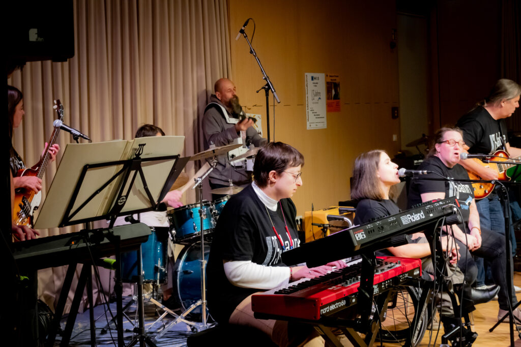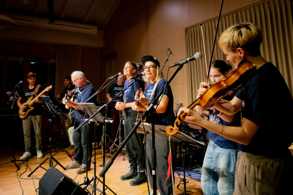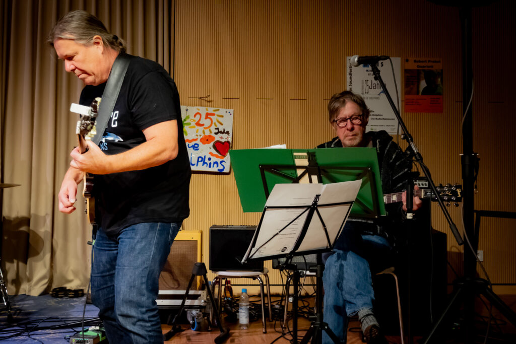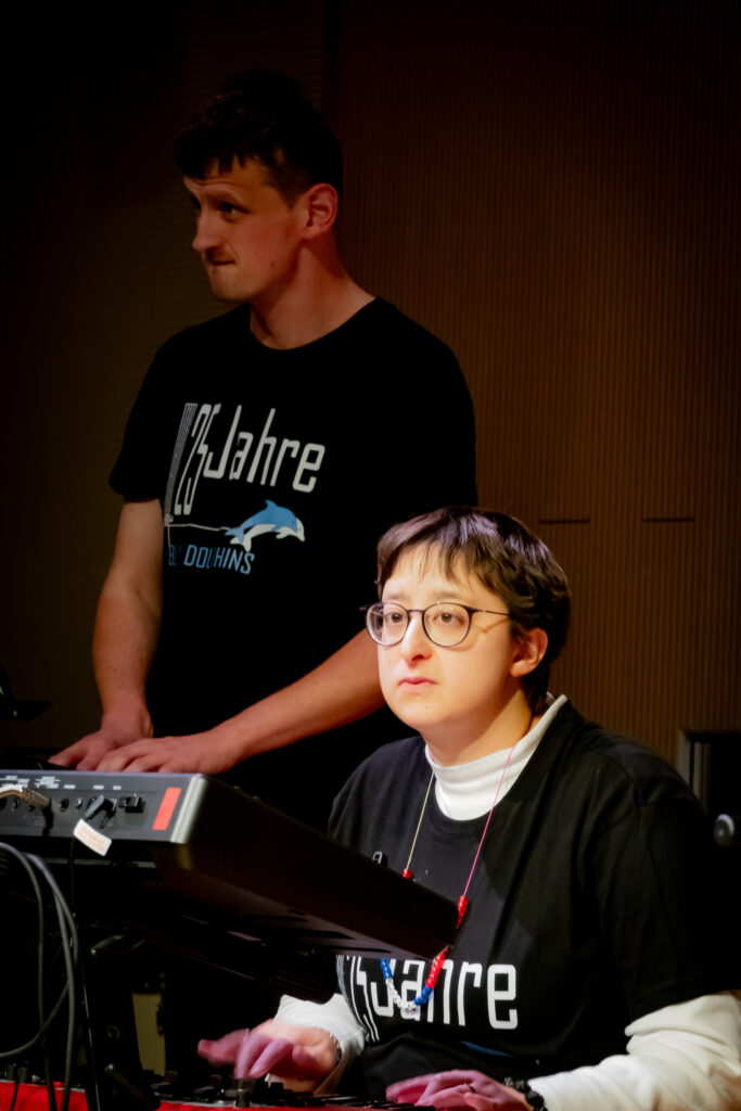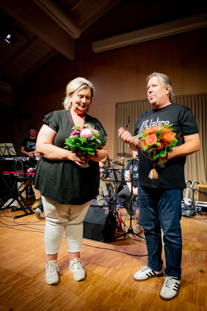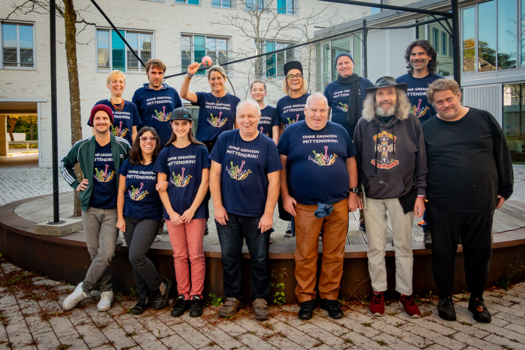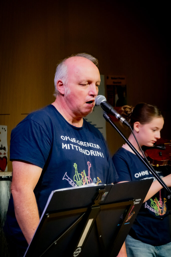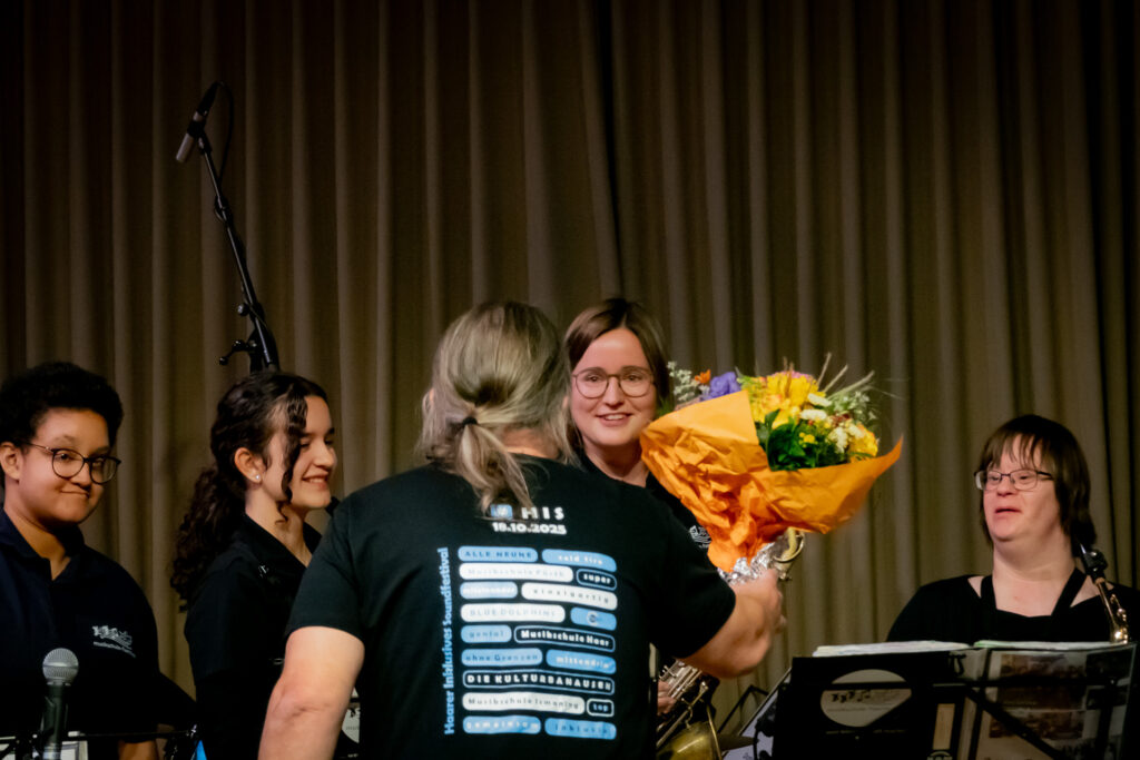 Die Blue Dolphins haben in ihren zweieinhalb Jahrzehnten schon viel erlebt. Zwei CDs wurden aufgenommen, den Tassilo Kulturpreis der SZ haben sie 2012 gewonnen und neben vielen kleineren Auftritten waren sie schon auf verschiedenen inklusiven Festivals in ganz Bayern unterwegs. Und so lag es nahe, selbst zu diesem Anlass auch ein Festival zu veranstalten. Schon mittags reisten die Bands an, man probte, kam zum Mittagessen zusammen und sah sich alte Bilder und Zeitungsausschnitte an. Die Fürther, die selbst schon erfahrene Soundfestivalveranstalter sind, kamen mit zwei Bands, die den Altersschnitt deutlich in eine jüngere Richtung zogen. Alle Neune, eine Band, in der die meisten Musiker ein Handicap haben und cold fire, eine junge Band der Musikschule Fürth, gingen dann auch erstmal zusammen auf die Bühne und zeigten, wie man das macht – einfach mal gemeinsam spielen und das Publikum begeistern. Die Kombi aus drei Saxophonen, Querflöte und Cello zu den üblichen Band-Instrumenten machte das zu einem besonderen Highlight. Nach einigen Liedern rockten dann cold fire ein paar Songs ohne die anderen, um dann zum Schluss ihres Auftritts aber wieder gemeinsam für Stimmung zu sorgen. Mit den Kulturbanausen der Musikschule Ismaning kamen noch mehr alte Bekannte – erst letztes Jahr hatte man sich dort zum „Ohne Grenzen mittendrin!“ getroffen und gemeinsam musiziert. Da wurden dann alte Klassiker präsentiert, manche davon mit neuem Text oder einfach auch mal mit Impro-Gesang. Und jeder der dabei war weiß – das Wort des Abends war „Heidelbeerjoghurt!“. Einfach genial. Zwei Gaststimmen hatten sie für das letzte Lied auch noch dabei. Das Gesangsduo Eli & Tina überraschte alle mit ihrem Song „Dabei“, das sie extra für die Kulturbanausen ein wenig umgeschrieben haben. Den Abend abschließen durften dann endlich die Blue Dolphins. Zuvor verteilte aber Clemens Wiedemann noch ein paar Geschenke, denn ohne die guten Geister im Hintergrund einer Musikschule, läuft gar nichts. So gab es Blumen für die Damen vom Büro, Nathalie und Johanna, und Herzerlwurst für unseren Hausallrounder Hans. Und als dann Clemens, als Leiter und Gitarrist der Blue Dolphins, endlich auch den Capo auf dem richtigen Steg sitzen hatte, konnten sie loslegen. Man merkt einfach, dass die neun Musikerinnen und Musiker zusammengewachsen sind – jeder Song klappte. Na gut – fast – aber das hat wahrscheinlich nur die Band selbst mitbekommen, denn hinten wurde getanzt, vorne geklatscht und auf der Bühne lauter strahlende Gesichter. Zwei Zugaben mussten es dann sein. Verdient und bejubelt.
