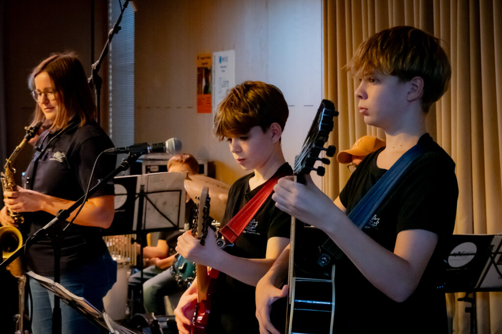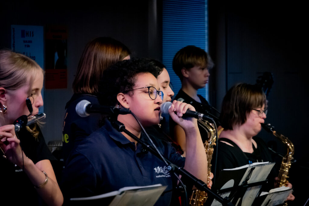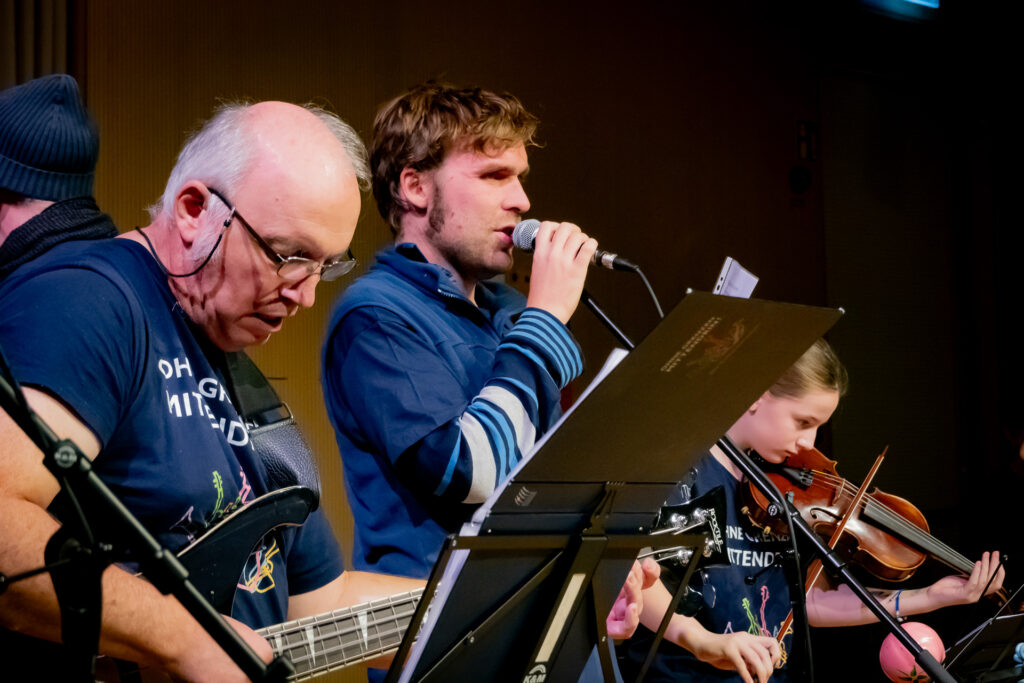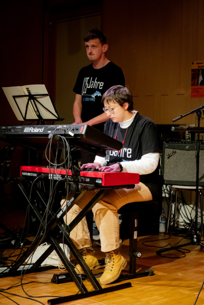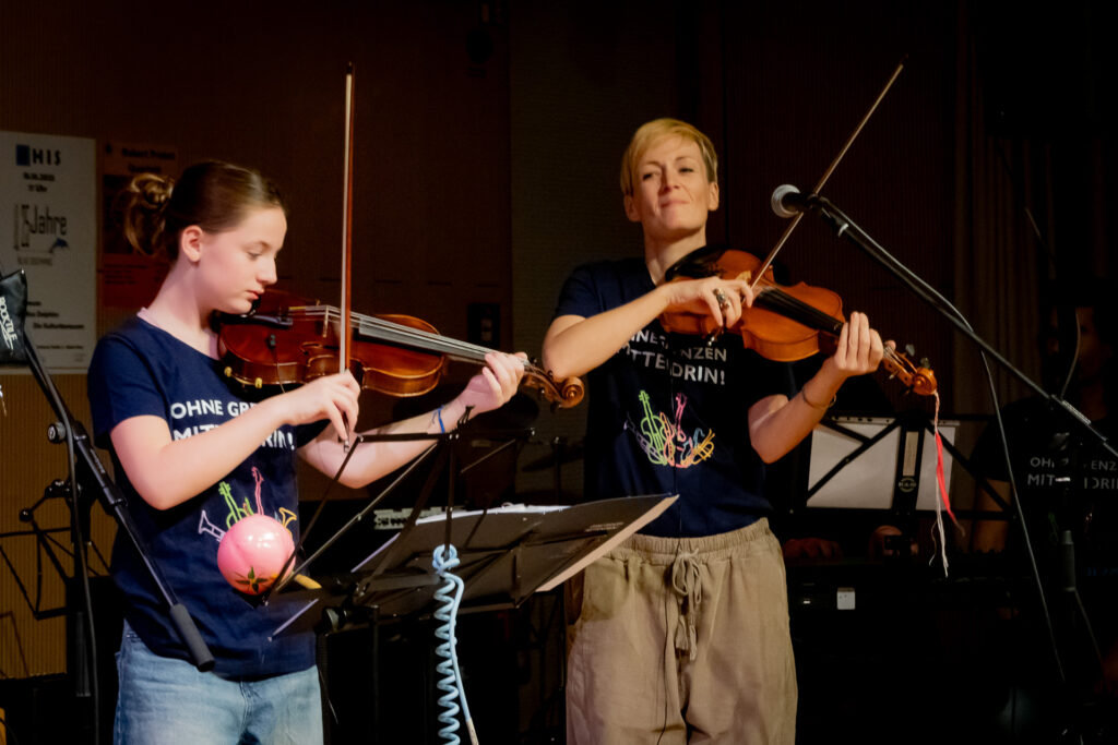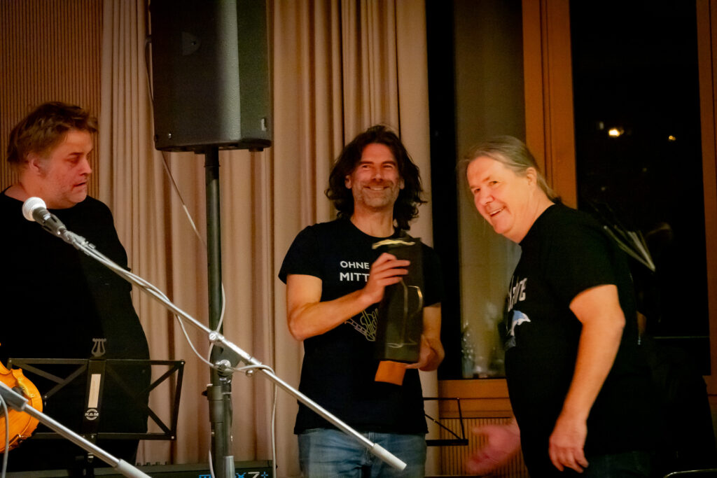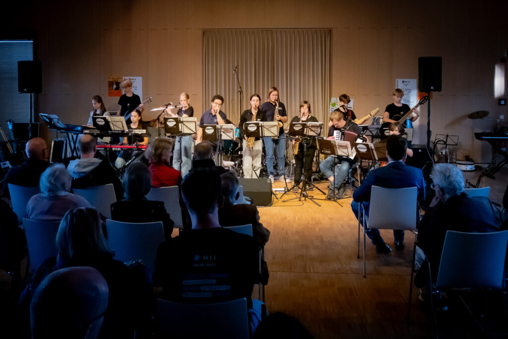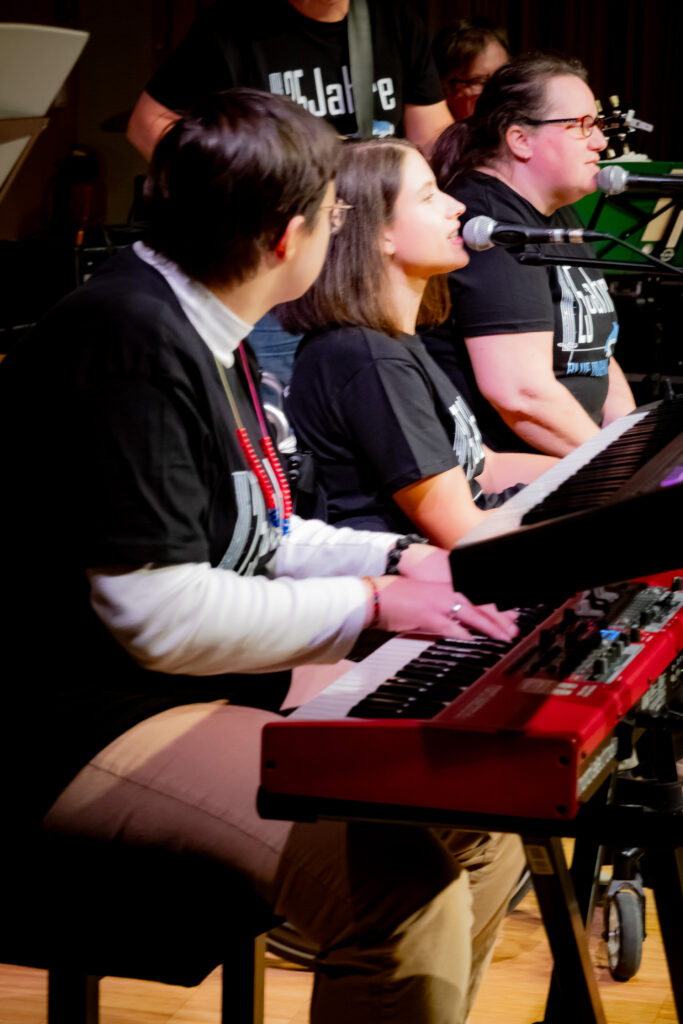 Die Blue Dolphins haben in ihren zweieinhalb Jahrzehnten schon viel erlebt. Zwei CDs wurden aufgenommen, den Tassilo Kulturpreis der SZ haben sie 2012 gewonnen und neben vielen kleineren Auftritten waren sie schon auf verschiedenen inklusiven Festivals in ganz Bayern unterwegs. Und so lag es nahe, selbst zu diesem Anlass auch ein Festival zu veranstalten. Schon mittags reisten die Bands an, man probte, kam zum Mittagessen zusammen und sah sich alte Bilder und Zeitungsausschnitte an. Die Fürther, die selbst schon erfahrene Soundfestivalveranstalter sind, kamen mit zwei Bands, die den Altersschnitt deutlich in eine jüngere Richtung zogen. Alle Neune, eine Band, in der die meisten Musiker ein Handicap haben und cold fire, eine junge Band der Musikschule Fürth, gingen dann auch erstmal zusammen auf die Bühne und zeigten, wie man das macht – einfach mal gemeinsam spielen und das Publikum begeistern. Die Kombi aus drei Saxophonen, Querflöte und Cello zu den üblichen Band-Instrumenten machte das zu einem besonderen Highlight. Nach einigen Liedern rockten dann cold fire ein paar Songs ohne die anderen, um dann zum Schluss ihres Auftritts aber wieder gemeinsam für Stimmung zu sorgen. Mit den Kulturbanausen der Musikschule Ismaning kamen noch mehr alte Bekannte – erst letztes Jahr hatte man sich dort zum „Ohne Grenzen mittendrin!“ getroffen und gemeinsam musiziert. Da wurden dann alte Klassiker präsentiert, manche davon mit neuem Text oder einfach auch mal mit Impro-Gesang. Und jeder der dabei war weiß – das Wort des Abends war „Heidelbeerjoghurt!“. Einfach genial. Zwei Gaststimmen hatten sie für das letzte Lied auch noch dabei. Das Gesangsduo Eli & Tina überraschte alle mit ihrem Song „Dabei“, das sie extra für die Kulturbanausen ein wenig umgeschrieben haben. Den Abend abschließen durften dann endlich die Blue Dolphins. Zuvor verteilte aber Clemens Wiedemann noch ein paar Geschenke, denn ohne die guten Geister im Hintergrund einer Musikschule, läuft gar nichts. So gab es Blumen für die Damen vom Büro, Nathalie und Johanna, und Herzerlwurst für unseren Hausallrounder Hans. Und als dann Clemens, als Leiter und Gitarrist der Blue Dolphins, endlich auch den Capo auf dem richtigen Steg sitzen hatte, konnten sie loslegen. Man merkt einfach, dass die neun Musikerinnen und Musiker zusammengewachsen sind – jeder Song klappte. Na gut – fast – aber das hat wahrscheinlich nur die Band selbst mitbekommen, denn hinten wurde getanzt, vorne geklatscht und auf der Bühne lauter strahlende Gesichter. Zwei Zugaben mussten es dann sein. Verdient und bejubelt.