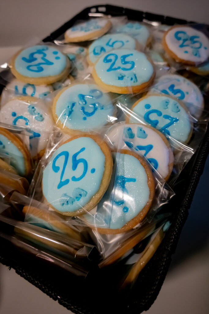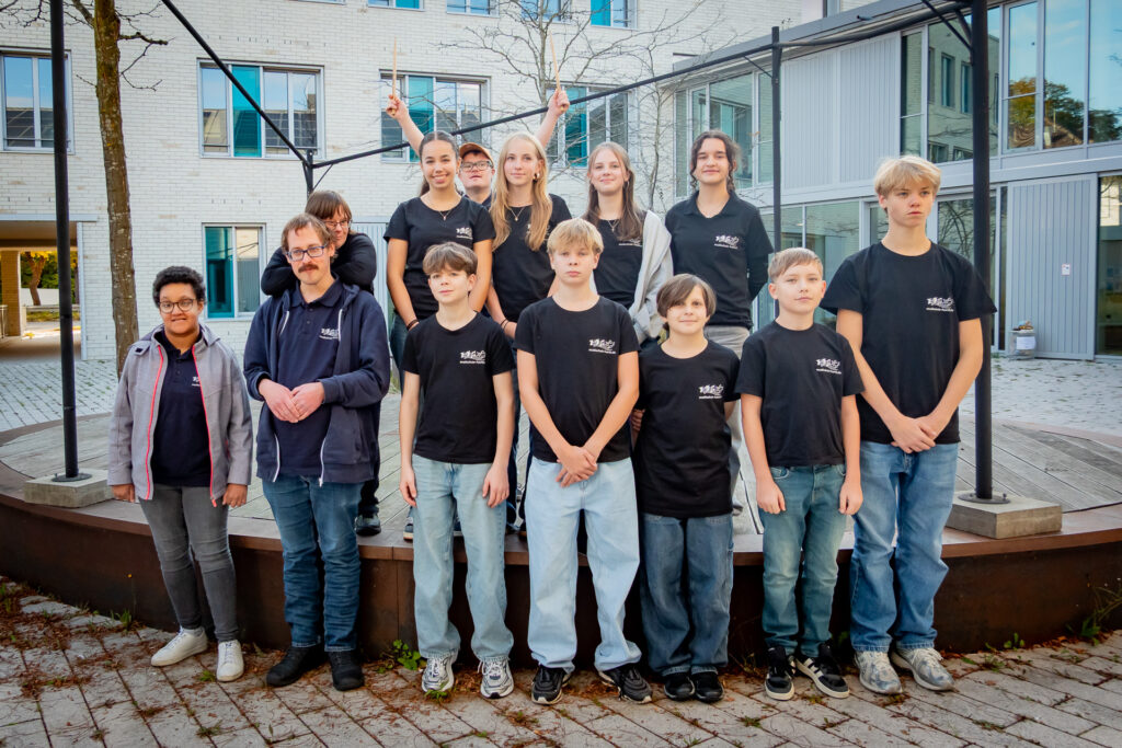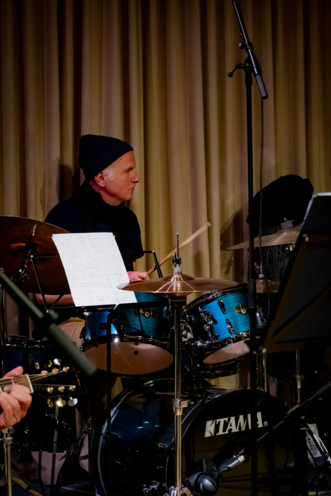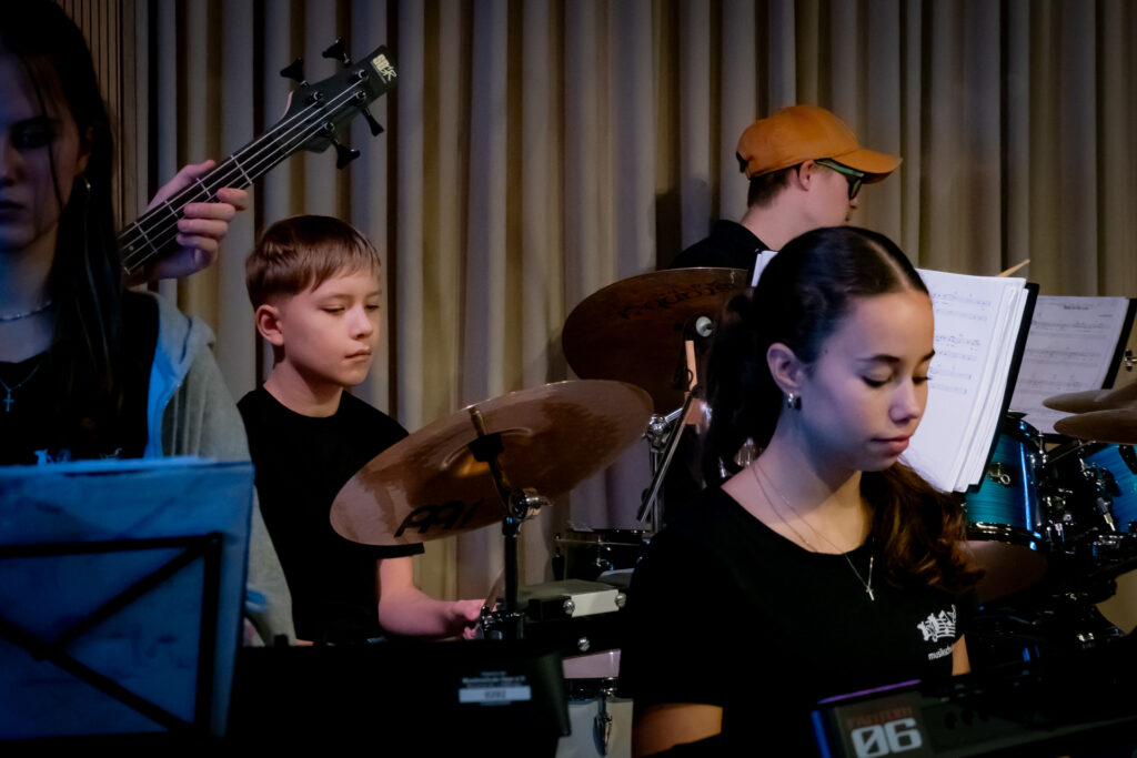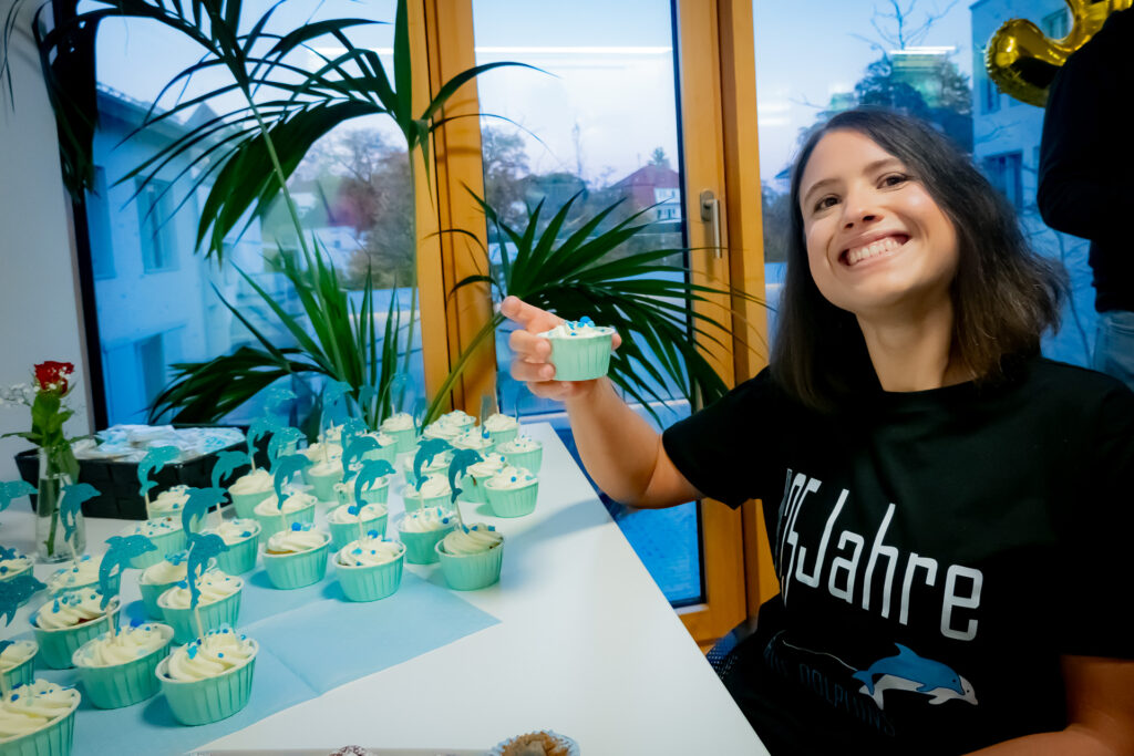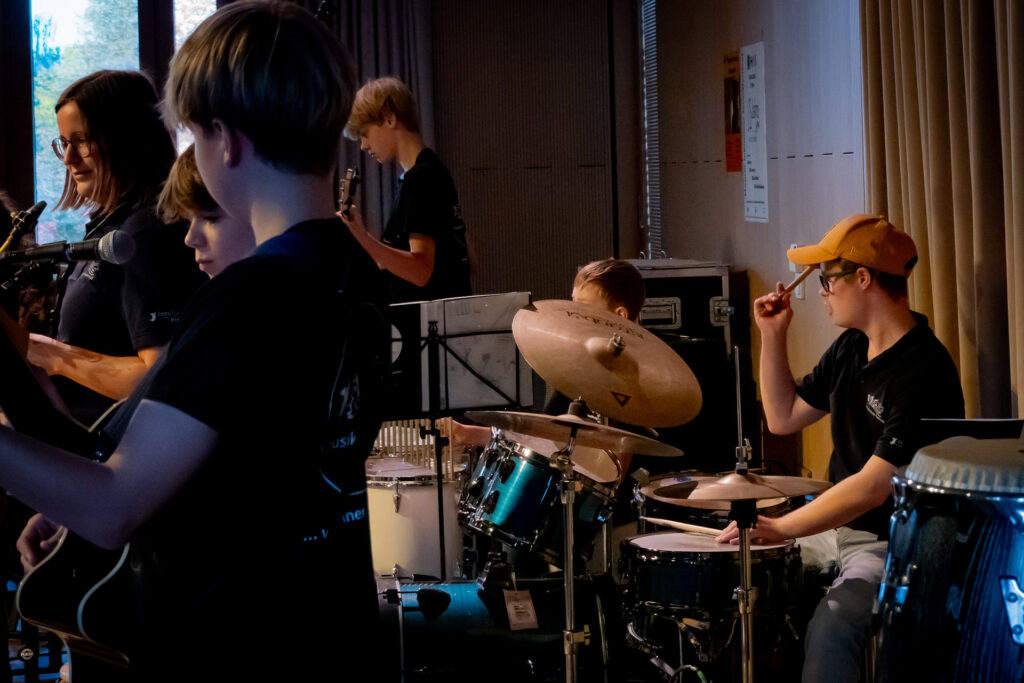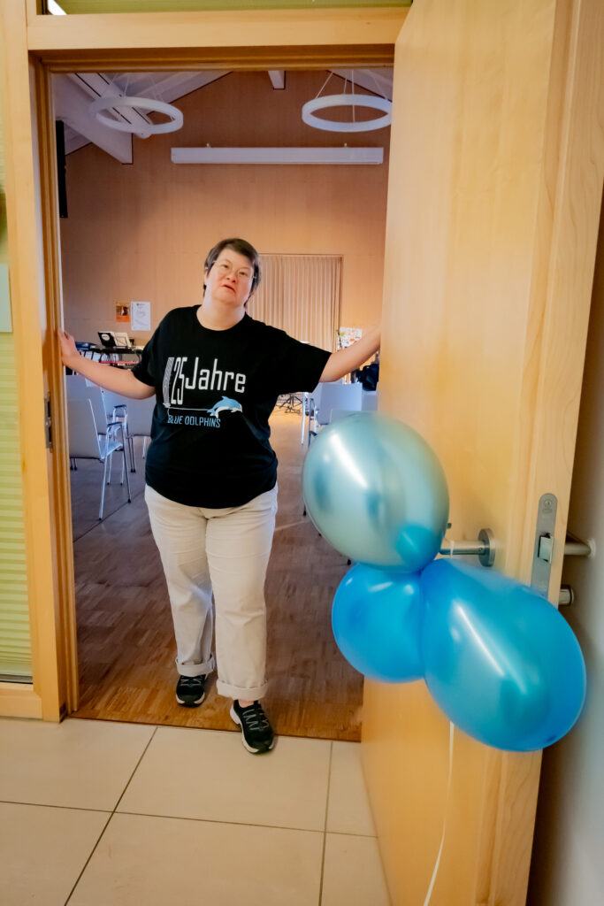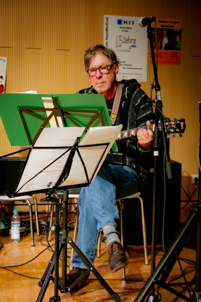 Die Blue Dolphins haben in ihren zweieinhalb Jahrzehnten schon viel erlebt. Zwei CDs wurden aufgenommen, den Tassilo Kulturpreis der SZ haben sie 2012 gewonnen und neben vielen kleineren Auftritten waren sie schon auf verschiedenen inklusiven Festivals in ganz Bayern unterwegs. Und so lag es nahe, selbst zu diesem Anlass auch ein Festival zu veranstalten. Schon mittags reisten die Bands an, man probte, kam zum Mittagessen zusammen und sah sich alte Bilder und Zeitungsausschnitte an. Die Fürther, die selbst schon erfahrene Soundfestivalveranstalter sind, kamen mit zwei Bands, die den Altersschnitt deutlich in eine jüngere Richtung zogen. Alle Neune, eine Band, in der die meisten Musiker ein Handicap haben und cold fire, eine junge Band der Musikschule Fürth, gingen dann auch erstmal zusammen auf die Bühne und zeigten, wie man das macht – einfach mal gemeinsam spielen und das Publikum begeistern. Die Kombi aus drei Saxophonen, Querflöte und Cello zu den üblichen Band-Instrumenten machte das zu einem besonderen Highlight. Nach einigen Liedern rockten dann cold fire ein paar Songs ohne die anderen, um dann zum Schluss ihres Auftritts aber wieder gemeinsam für Stimmung zu sorgen. Mit den Kulturbanausen der Musikschule Ismaning kamen noch mehr alte Bekannte – erst letztes Jahr hatte man sich dort zum „Ohne Grenzen mittendrin!“ getroffen und gemeinsam musiziert. Da wurden dann alte Klassiker präsentiert, manche davon mit neuem Text oder einfach auch mal mit Impro-Gesang. Und jeder der dabei war weiß – das Wort des Abends war „Heidelbeerjoghurt!“. Einfach genial. Zwei Gaststimmen hatten sie für das letzte Lied auch noch dabei. Das Gesangsduo Eli & Tina überraschte alle mit ihrem Song „Dabei“, das sie extra für die Kulturbanausen ein wenig umgeschrieben haben. Den Abend abschließen durften dann endlich die Blue Dolphins. Zuvor verteilte aber Clemens Wiedemann noch ein paar Geschenke, denn ohne die guten Geister im Hintergrund einer Musikschule, läuft gar nichts. So gab es Blumen für die Damen vom Büro, Nathalie und Johanna, und Herzerlwurst für unseren Hausallrounder Hans. Und als dann Clemens, als Leiter und Gitarrist der Blue Dolphins, endlich auch den Capo auf dem richtigen Steg sitzen hatte, konnten sie loslegen. Man merkt einfach, dass die neun Musikerinnen und Musiker zusammengewachsen sind – jeder Song klappte. Na gut – fast – aber das hat wahrscheinlich nur die Band selbst mitbekommen, denn hinten wurde getanzt, vorne geklatscht und auf der Bühne lauter strahlende Gesichter. Zwei Zugaben mussten es dann sein. Verdient und bejubelt.
